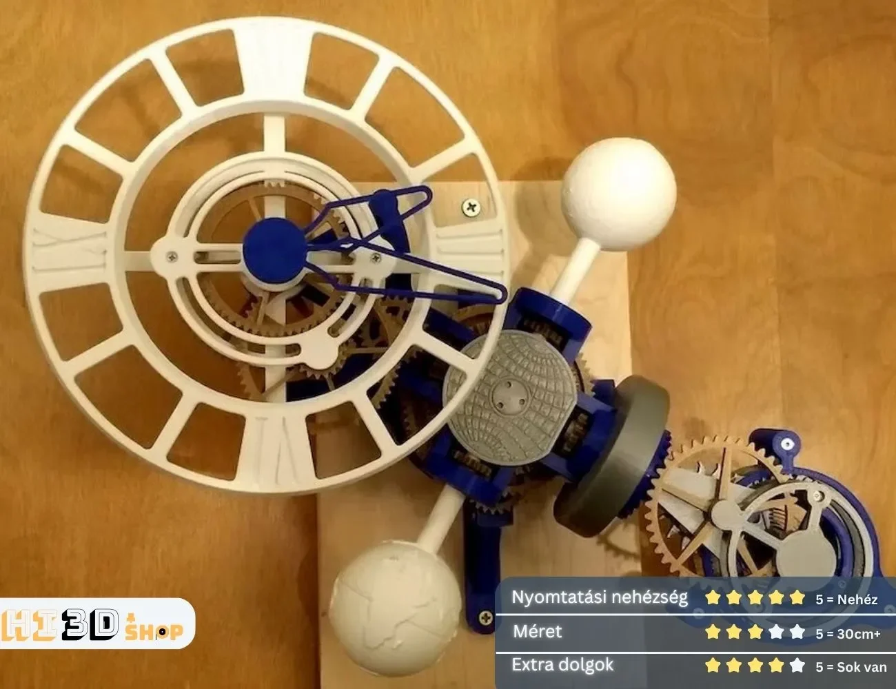 1. Nyomtatási nehézség – 4/5: Az óra összeszerelése és a pontos nyomtatás megköveteli a felhasználótól, hogy tapasztalt legyen a 3D nyomtatás terén, mivel a toleranciák szorosak.