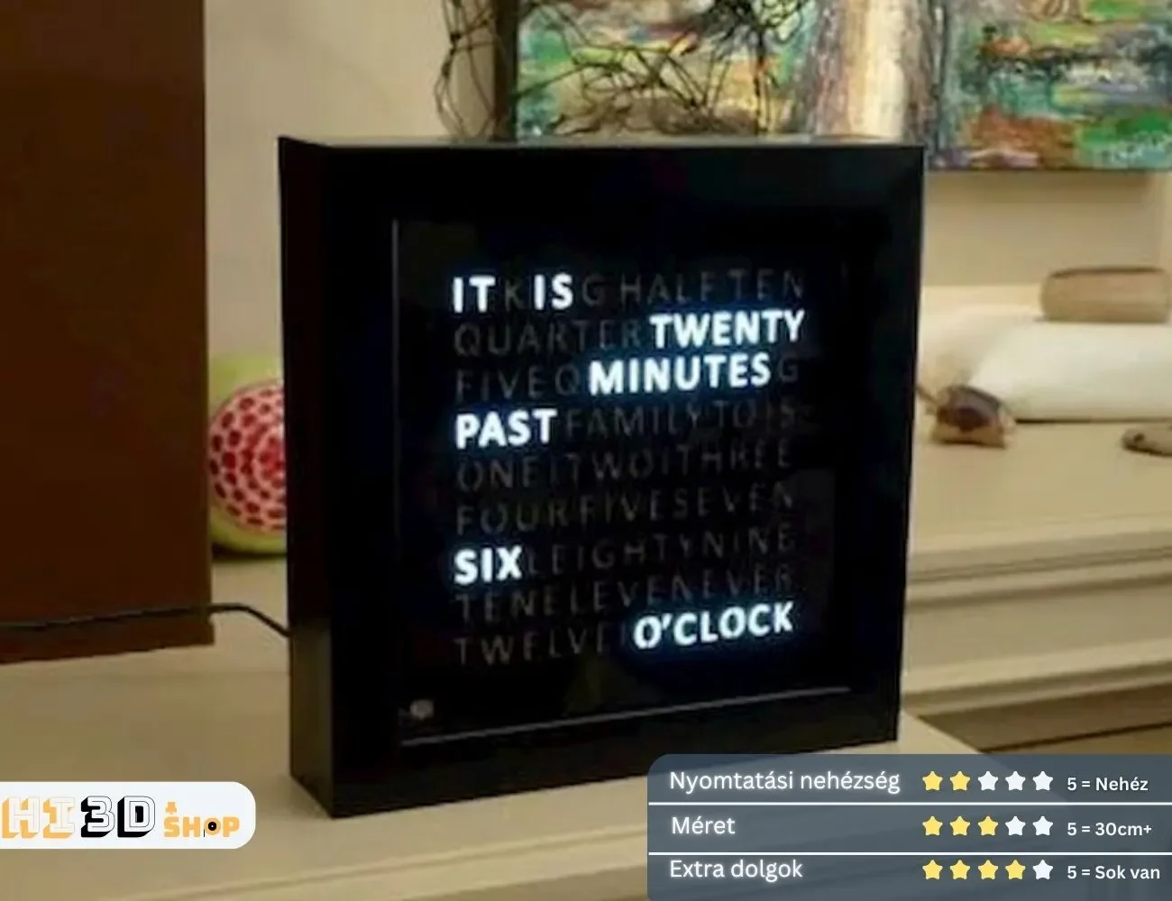Ez egy nagyszerű kinézetű 3D nyomtatott óra, amely érdekes hétvégi projektet kínál. A projekt során a felhasználónak ki kell nyomtatnia a „fénykútakat” és az elülső lemezt, majd diffúzorokat és LED-eket kell hozzáadnia. Az elektronikai összekapcsolás, a szoftver implementálása után pedig kész is a nagyon egyedi 3D óra. A nyomtatott alkatrészek laposak és viszonylag egyszerűnek tűnnek, így a legnagyobb erőfeszítések az elektronikai munkákra összpontosulnak. Az óra nemcsak funkcionális, hanem esztétikus is, így remek dísze lehet bármely otthonnak. A projekt során a felhasználók nemcsak a nyomtatási folyamatot tanulják meg, hanem a világítás és az elektronika összekapcsolásának alapjait is.