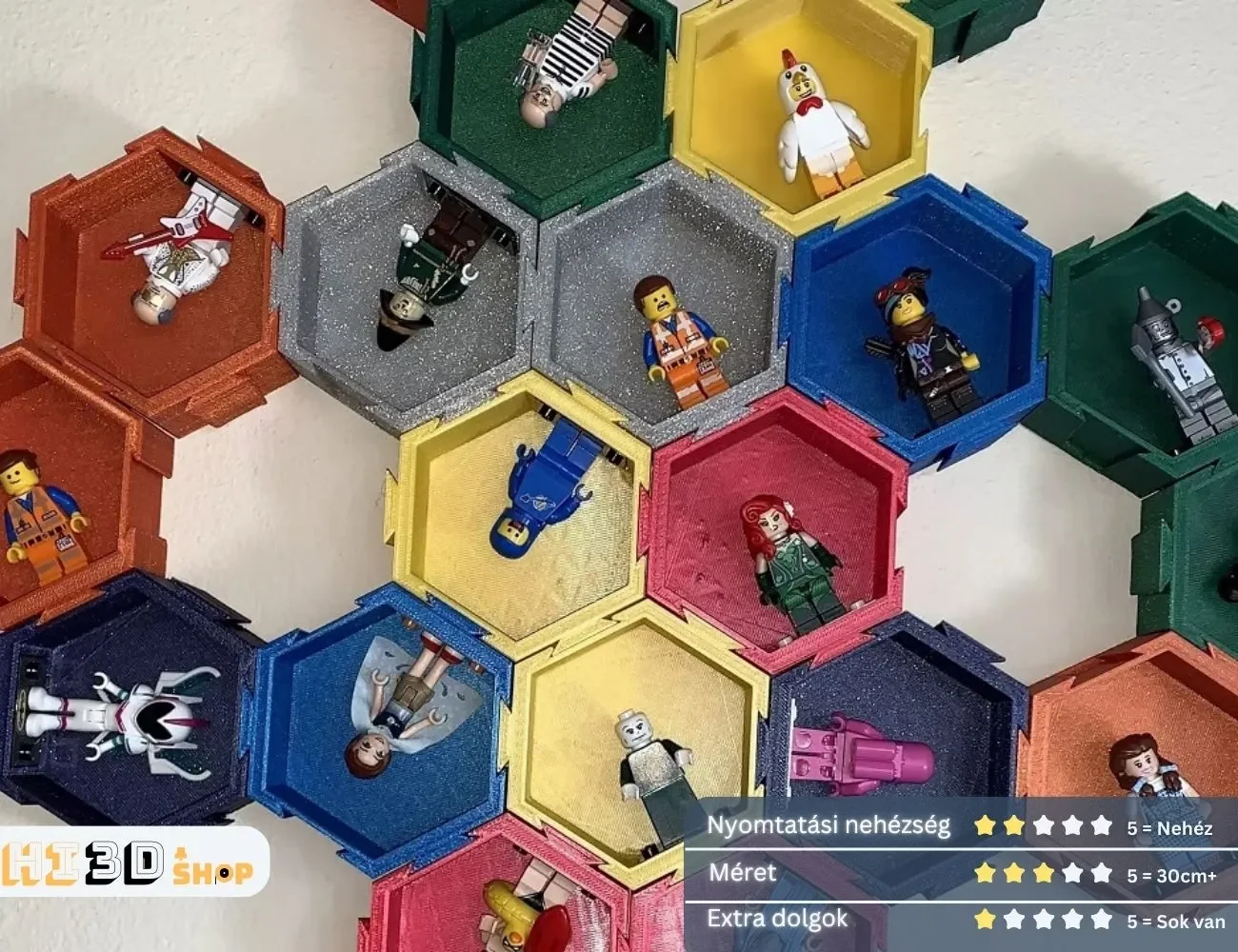 A hexagonális kijelző praktikus és esztétikus megoldás a LEGO figurák tárolására és bemutatására.